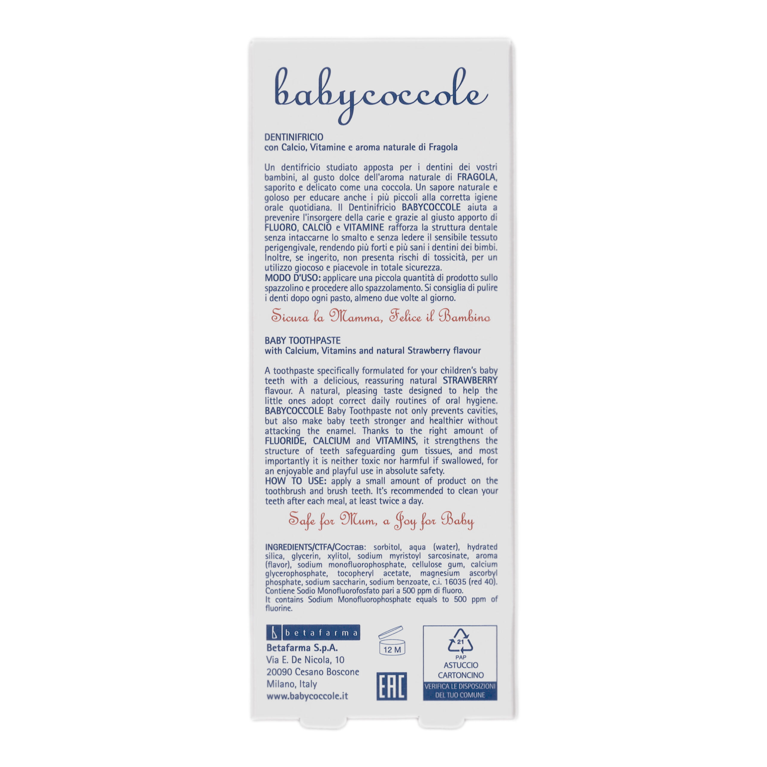 Главная Средства по уходу за детьми Детская зубная паста Зубная паста детская клубника Babycoccole с витаминами и кальцием 75 мл